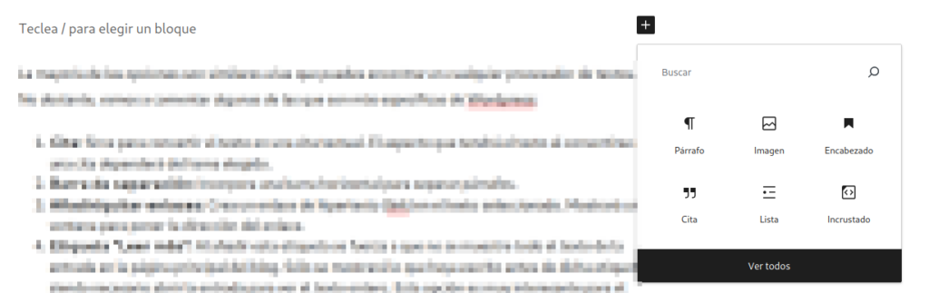 La mayoría de las opciones son similares a las que puedes encontrar en cualquier procesador de textos. No obstante, si le damos a «Ver todos», veremos que existen una gran cantidad de bloques que se pueden usar para dar contenido o estructura a nuestras entradas. Te recomiendo que pruebas algunas de ellas, para que te hagas una idea de las posibilidades: