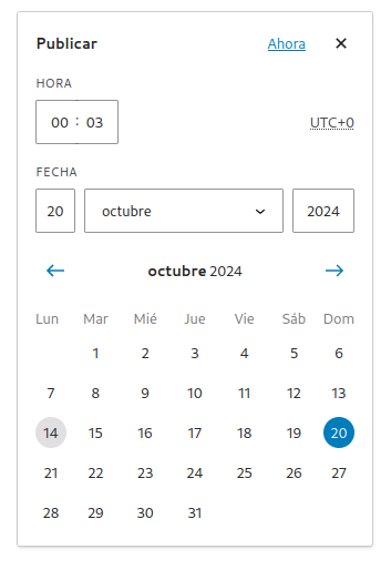 Para que la opción de programar publicación funcione correctamente, asegúrate que en Ajustes – General está bien configurado el huso horario: por defecto se coge la hora del servidor que no tiene por qué estar en España.