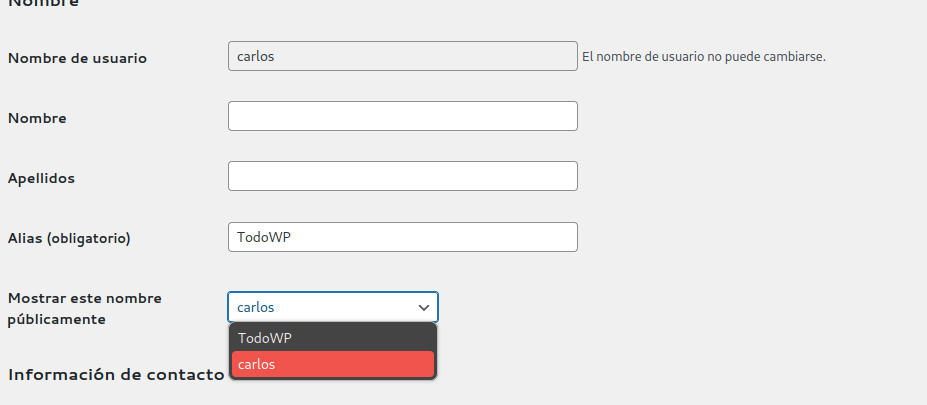 Campo alias: Permite definir un nombre diferente al del nombre de usuario que se puede usar para firmar las entradas del blog desde la opción «Mostrar este nombre públicamente». Esto es interesante si queremos ocultar nuestro nombre de usuario a los visitantes, por motivos de seguridad (al fín y al cabo es el login del cuadro de administarción) y también de privacidad.