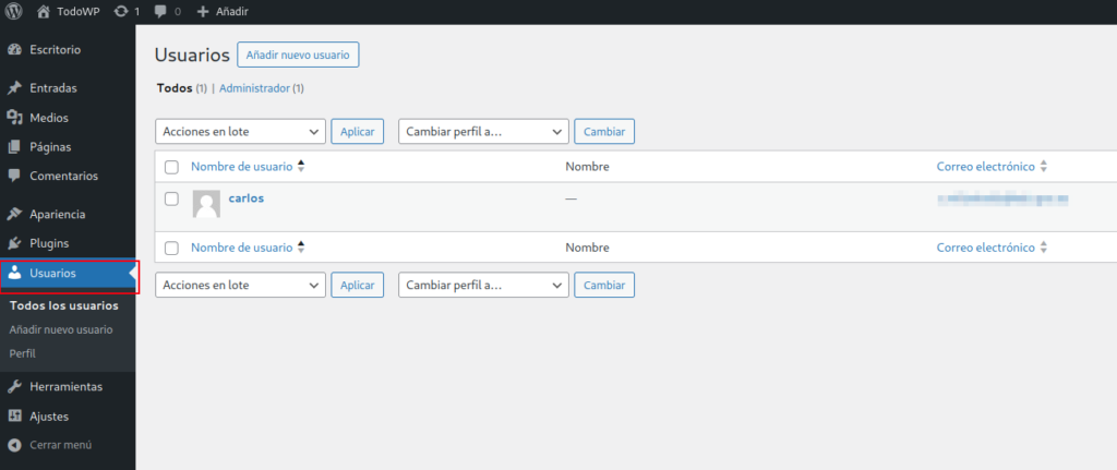 Antes de empezar, vamos a ver qué información se almacena en WordPress de nuestro usuario. Para ello, iremos a la sección Usuarios del panel de administración. Como puedes ver, sólo hay un usuario (el correspondiente al usuario que ha hecho la instalación, es decir, el nuestro).