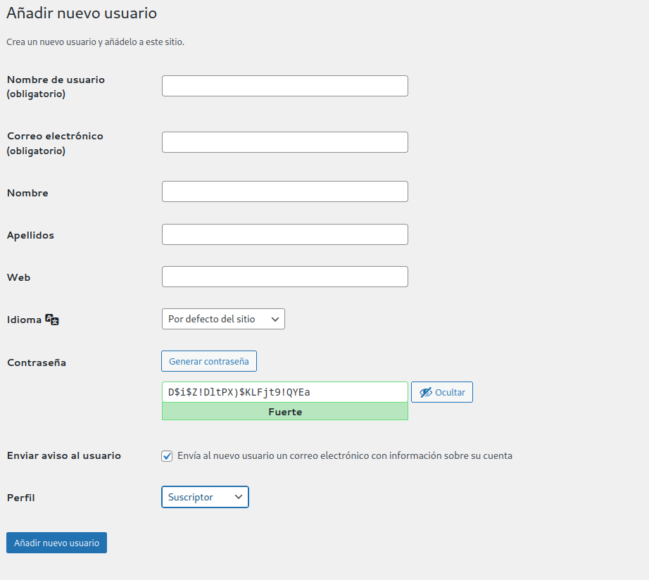 Seleccionamos la opción desde el menú Usuarios y accedemos a un formulario que nos pide los datos del nuevo usuario.