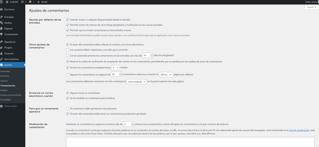 WordPress trata de mitigar el impacto negativo de esas interacciones mediante la moderación. Si le has echado un vistazo a la sección de Ajustes > Comentarios, habrás visto que hay varias opciones para limitar que un comentario se publique directamente.